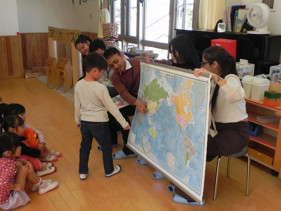 はじめに留学生の母国紹介を行いました。園児たちはそれぞれの国の有名な場所・動物や食べ物、伝統的な衣装などの写真を見せてもらいながら、留学生の話を楽しそうに聞いていました。