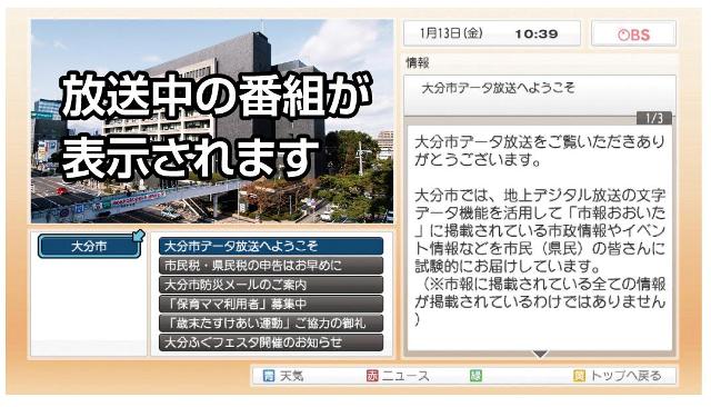 OBS大分放送のデータ放送で、大分市のお知らせやイベント・観光情報などがご覧いただけます。