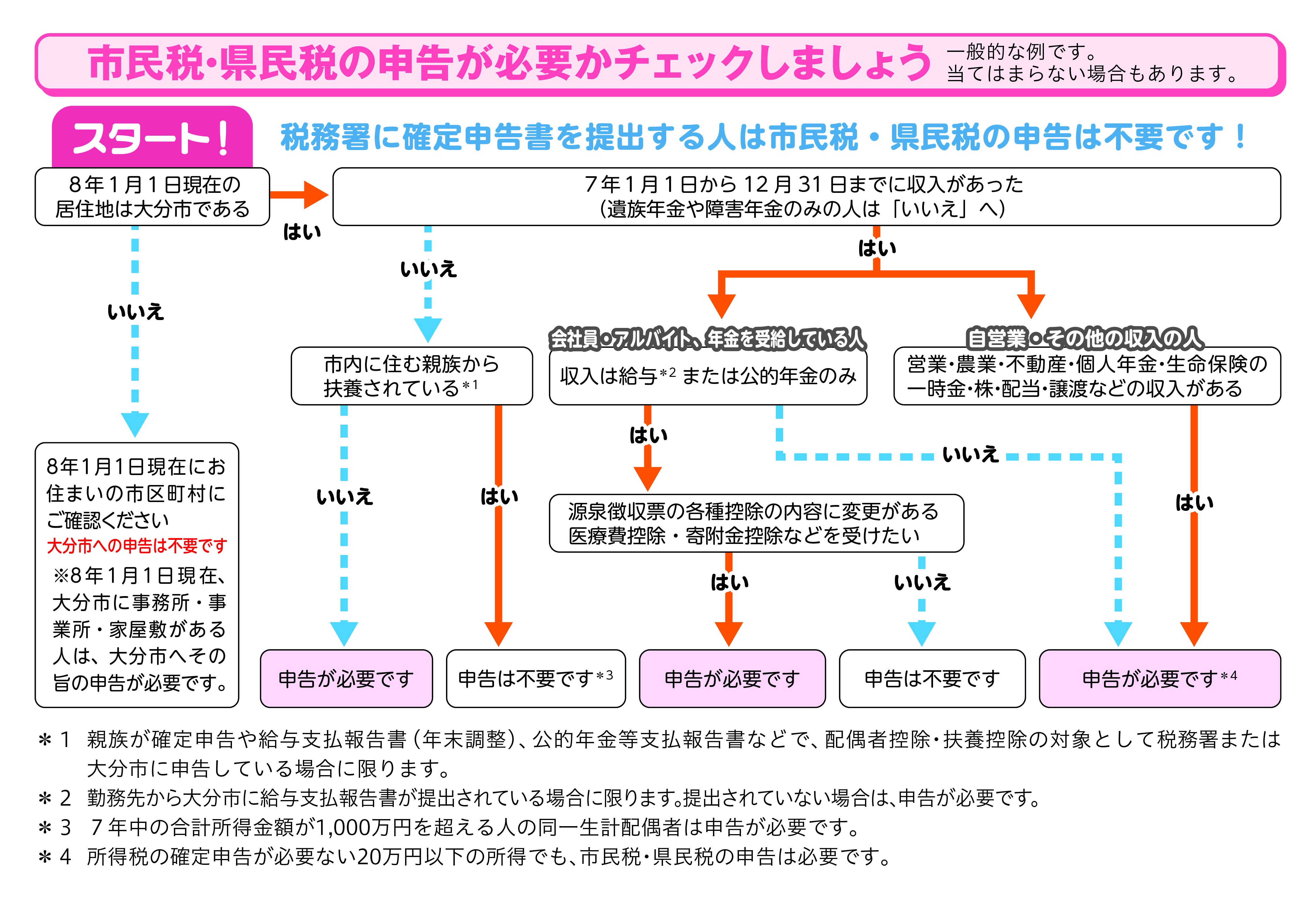 令和7年度未申告の人または提出済みで令和8年度も申告が必要と思われる人には、1月下旬に「令和8年度 市民税・県民税 申告書」を送付しますが、お急ぎで必要な人または申告しなければならない人は、市民税課までご連絡ください。なお、申告書は各支所(鶴崎、稙田市民行政センターは各資産税事務所)にも用意しています。