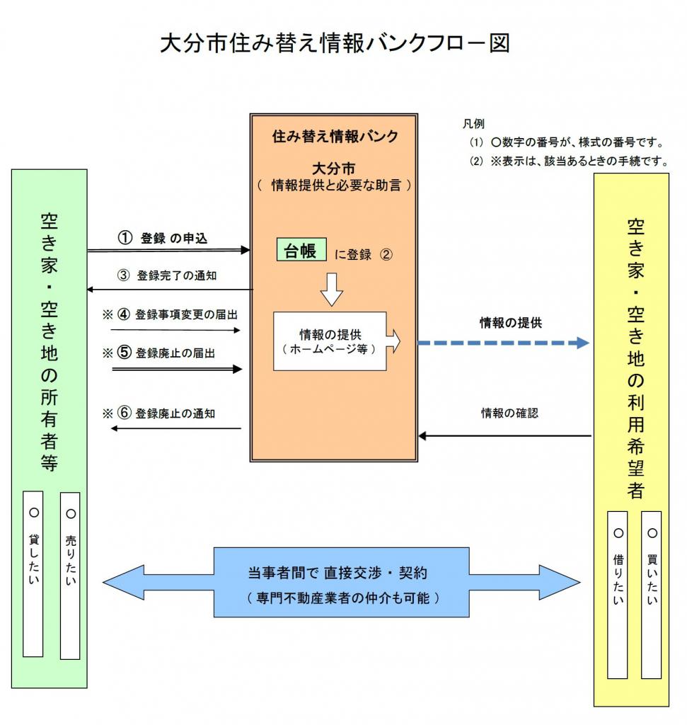 ※大分市は、売買・賃貸に関する交渉・契約に関する仲介行為は一切行いません。契約に関するトラブル等については、当事者間で責任を持って解決をお願いします。また、個人情報保護法に基づき、個人情報等については、本業務のみに利用し、他業務に利用することはしません。