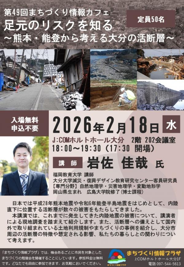 本講演では、これまでに発生してきた内陸地震の被害について、講演者による現地調査を踏まえて紹介します。また、活断層への備えとして国内外で取り組まれている土地利用規制やまちづくりの事例を紹介し、大分市周辺の活断層の特徴や想定される影響、私たちの暮らしとの関わりについて考えます。